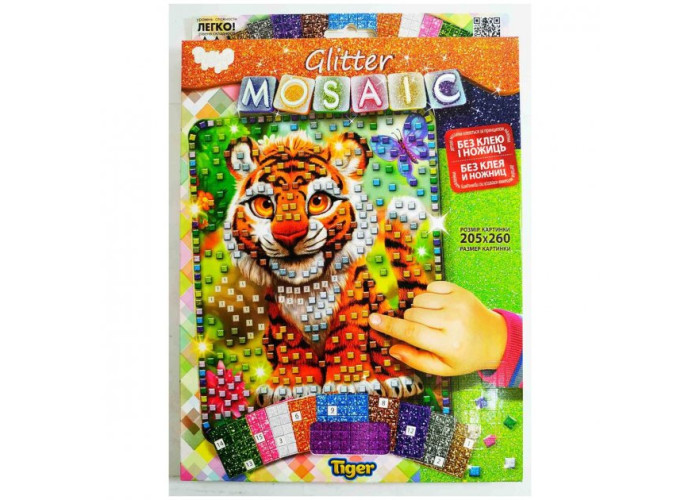 У наборі гнучкі палетки різних кольорів. Кожен кольоровий блок має номер. Дитина вибирає і відокремлює елементи мозаїки за номером та кольором і кріпить палетки на картонну основу-заготовку. В результаті зусиль і копіткої праці виходить кольорова картинка-мозаїка, зроблена своїми руками. Розмір упаковки: 29,5х21,5 см. Розмір картинки: 20,5х26 см.