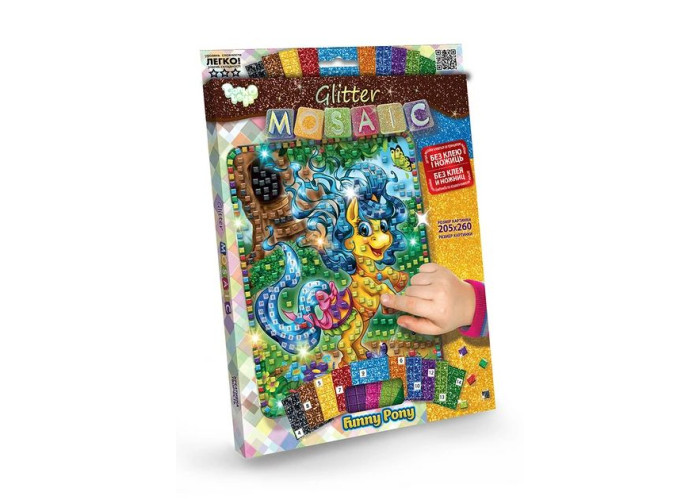 У наборі гнучкі палетки різних кольорів. Кожен кольоровий блок має номер. Дитина вибирає і відокремлює елементи мозаїки за номером та кольором і кріпить палетки на картонну основу-заготовку. В результаті зусиль і копіткої праці виходить кольорова картинка-мозаїка, зроблена своїми руками. Розмір упаковки: 29,5х21,5 см. Розмір картинки: 20,5х26 см.