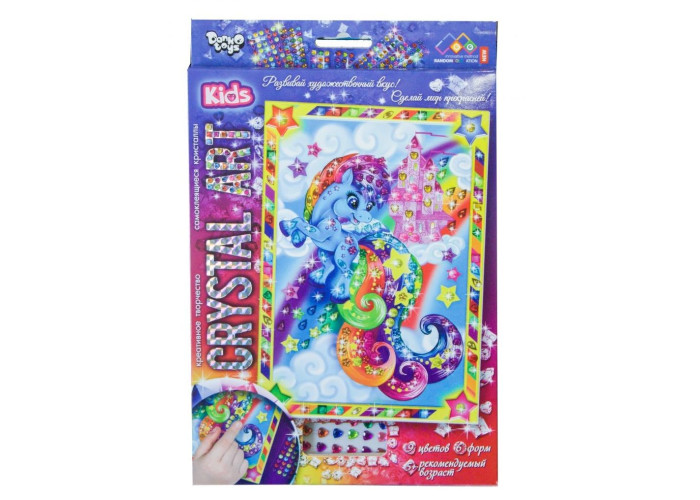 Розкладіть перед собою складові набору: схему-картину і палетки з кристалами. Кожна форма кристалів наклеєна на прозору палетку і вже має клейовий шар. Ножиці і клей не знадобляться. По завершенні роботи над картинкою прикрасьте кристалами рамку. 9 кольорів, 6 форм.