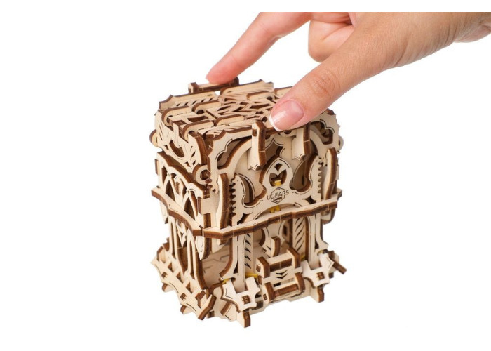 3D пазл "Дек Бокс" від Ugears – це симпатична скринька, настільки компактна, що вона легко поміститься на долоні. Модель відкривається легким натисканням на спеціальні виступи на бічних сторонах кришки. Під тиском верхні частини бічних панелей опустяться донизу, а кришка розсунеться. Так ви отримаєте доступ до двох внутрішніх відділень. Пристрій автоматично фіксується у відкритому положенні.