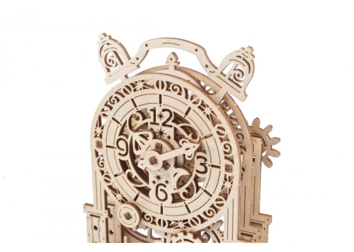3D пазл від Ugears "Вінтажний будильник" — це повернення в недалеке минуле, миле нагадування про механічний будильник, що стоїть на тумбочці в будинку ваших батьків чи бабусь і дідусів. Щоб завести механізм, потрібно обертати велику шестерню зліва. Годинничок оживе – стрілки обертатимуться, а дерев’яні дзвіночки над циферблатом почнуть рухатися та видавати звук, характерний для будильника. Хоча ця декоративна дерев’яна модель насправді не показує час, стрілки годинника налаштовані так, що один повний оберт хвилинної стрілки переміщує годинну стрілку на одну позицію. Будильничок має цікавий дизайн циферблата з елементами сонця та рослин, а разом із колонами, що ніби підтримують циферблат, схожий на привабливу архітектурну споруду у венеційському стилі.