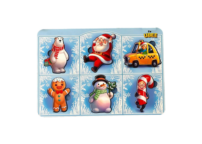 Новорічні вкладиші з підказкою-силуетом кожного героя на дні. Рамки-вкладиші розвивають дрібну моторику пальчиків (яка безпосередньо пов'язана з розвитком мови), координацію рухів, сенсорику, тактильні відчуття, допомагають навчити початковому рахунку (від 1 до 6).