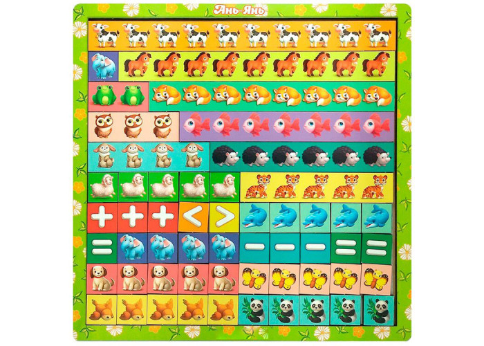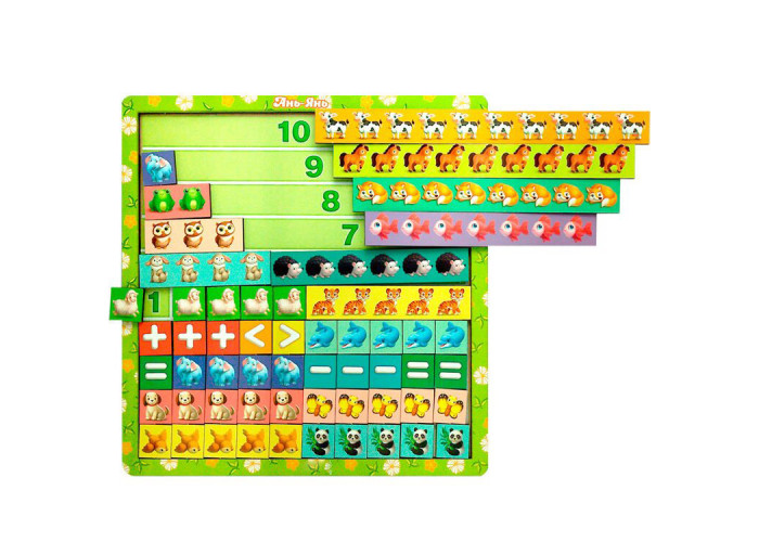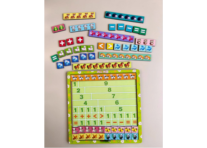 Математичні сходинки - це набір лічильного матеріалу: лінійки із зображенням тварин від 1 до 10, а також математичні знаки: +; -; =; . Ця гра допоможе дитині вивчити цифри, співвідношення числа і кількості, прямий і зворотній рахунок, склад числа, поняття "більше" і "менше", "більше на ...". Викладіть поряд 2 лінійки, наприклад, з числами 5 і 2 та поясніть дитині, що 5 більше, ніж 2 на 3 одиниці і покладіть 3 плашки одинички. Навчіть ділити ціле на частини і вимірювати предмети мірками, наприклад число 6=6 плашок по 1 зображенню. Поясніть склад числа, наприклад, числа 7=6+1, 7=5+2, 7=4+3. Такі вправи відмінно підходять для вивчення прикладів додавання і віднімання. Приємних і корисних вам занять!