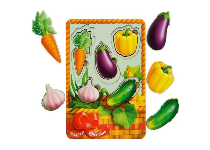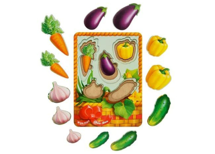 Вкладиші у вигляді овочів наочно познайомлять Вашу дитину з овочами. На рамці представлені 5 видів овочів 3-х розмірів (всього 15 вкладишів): огірок, часник, баклажан, перець і морква. Вставляючи фігурки на дерев'яну основу, малюк знайомиться з формами, розвиває координацію, точність, просторове мислення, розбереться в поняттях "більше-менше".