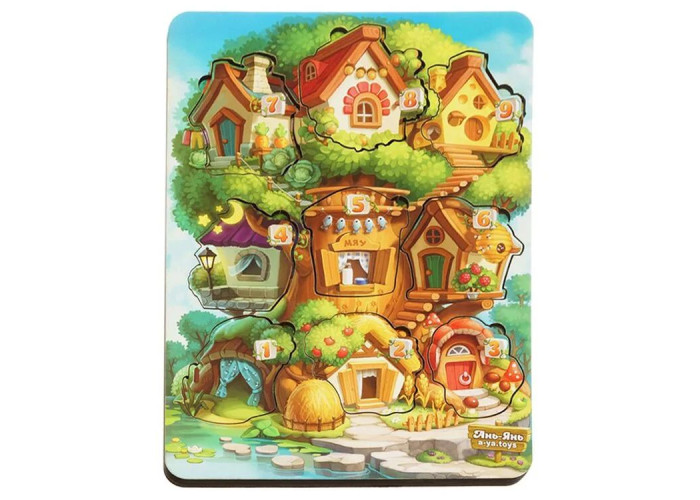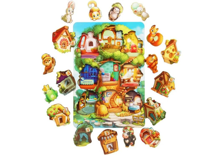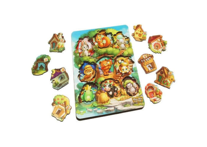 Тришаровий пазл виконаний у вигляді дерева, на якому розташувалися будиночки 9 різних тварин. Кожен будиночок має свій номер від 1 до 9 і тематичне оформлення (індивідуальний дизайн як усередині, так і зовні), яке підкаже, що за тварина може там жити.