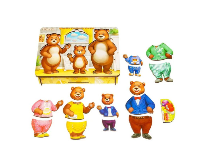 Гра-роздягальня «3 ведмедя» - це великі тематичні пазли для самих маленьких. Ведмедики на планшеті розбираються на окремі частини так, що їм можна змінювати вбрання. Підбираючи одяг, дитина співвідносить її розміри і тип із заданим стилем. Можна сказати: «Зараз ведмедик лягає спати (йде на прогулянку)» - і попросити підібрати відповідний одяг. Під час гри з рамками-вкладишами можна придумати персонажам імена, описати їх характери.