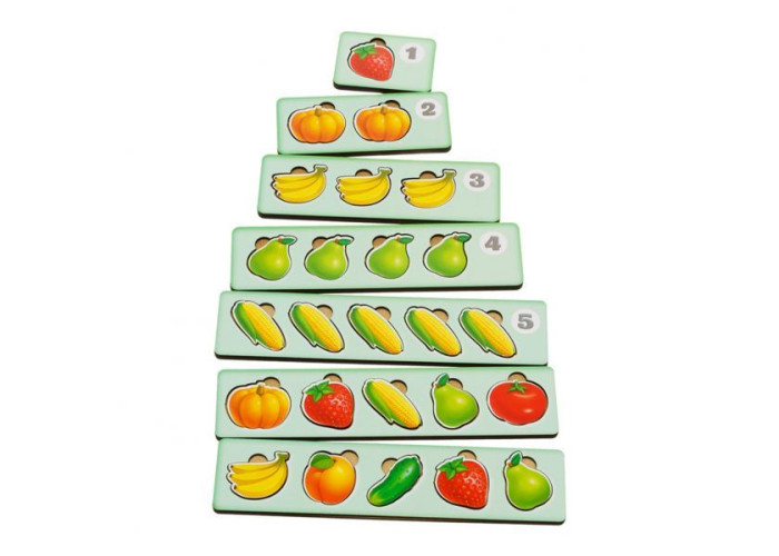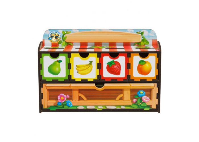 Чарівна скринька для навчання дитини рахунку і кольорам. У наборі йдуть 7 планок з різною кількістю вкладишів овочів і фруктів: банан, абрикос, груша, полуниця, гарбуз, огірок, помідор, кукурудза, які необхідно правильно вкласти в 4 двосторонніх скриньки (малюнок з двох сторін) за кольором і тематичним зображенням.