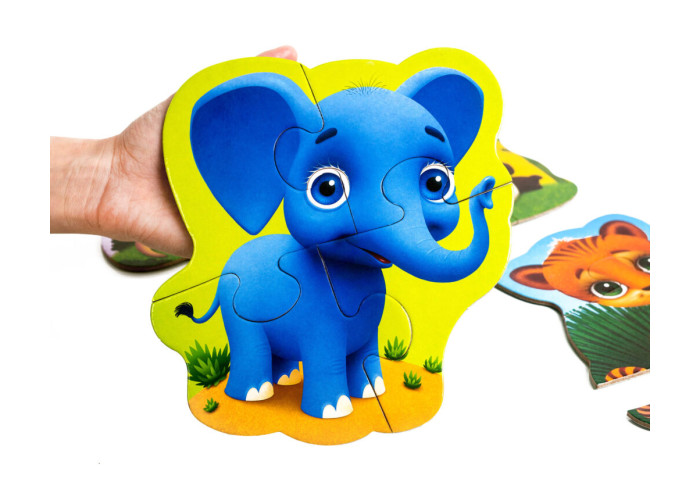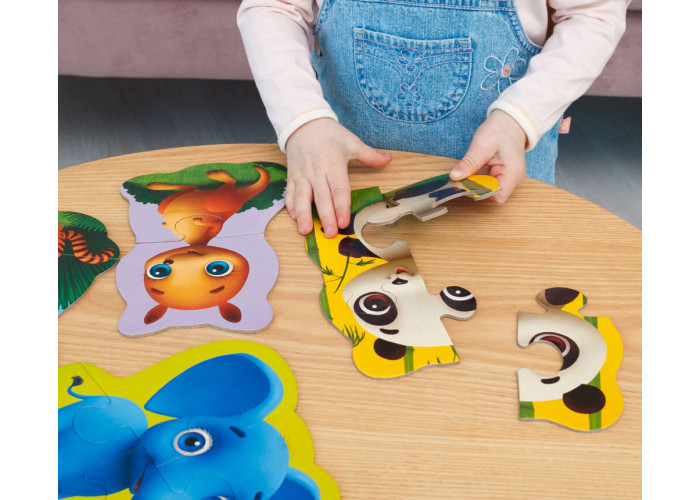 Об'єднуйте елементи пазлів між собою і складайте яскраві картинки з левеням, пандочкою, слоником і кенгуру.