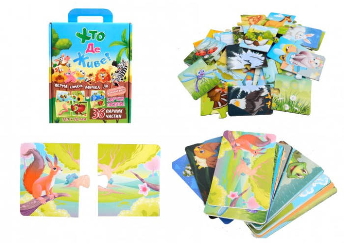 Не тільки розвага, а й навчання - міні-пазли «Хто де живе» познайомлять малюка з мешканцями ферми і лісу, тваринами Африки і комахами. Крім цього покажуть місця, де вони мешкають. Всього в наборі 36 міні-пазлів, що складаються з двох частин - необхідно підібрати кожній тварині його житло. Щоб допомогти малюкові в комплекті є картки з готовими картинками. Процес складання малюнка з окремих фрагментів зображення допоможе розвинути не тільки логіку, уяву, пам'ять, але і фізичні навички - такі як координацію і моторику пальчиків. Ігри з пазлами сприяють розвитку особистості та характеру малюка - посидючості, акуратності та наполегливості. Високоякісна зносостійка поліграфія збереже зображення навіть після багаторазового збирання. Кількість елементів кожного пазла - 2, розмір картинок - 12х7 см, упаковані елементи в красиву коробку з ручкою. Мова українська.