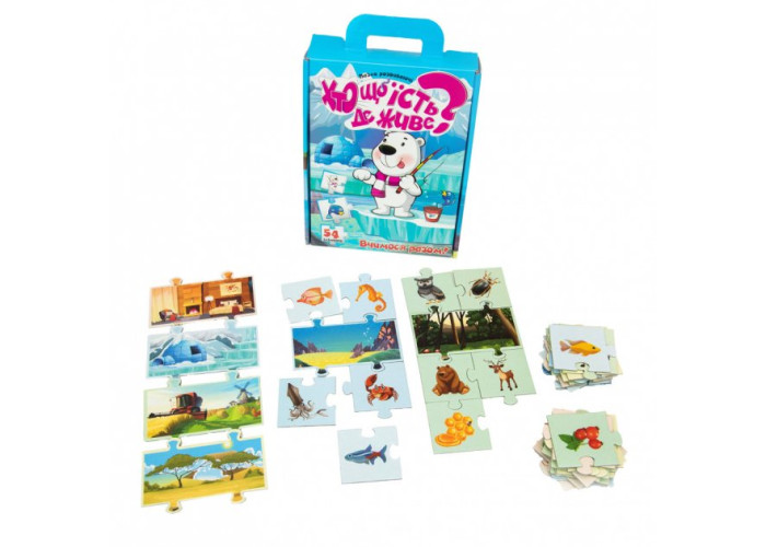 "Хто що їсть? Де живе?" - це цікава гра, яка розвиває логічне мислення дітей і дає можливість дізнатися більше про тварин світу. Діти в ігровій формі з'ясовують, де живуть і чим харчуються тварини, і збирають невеликий пазл з карток. Таке заняття покращує дрібну моторику рук дитини, її уважність і посидючість. Гра містить 54 елемента з яскравими картинками і розрахована на дітей від трьох років. Грати можна як великою компанією, так і наодинці з дитиною.