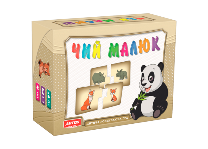 Логічні пазли «ЧИЙ МАЛЮК» представляє собою дидактичну мозаїку для дітей. У неї входить 30 картонних карток, кожна з яких складається з двох елементів. На половинках зображені знайомі дітям тварини, до яких потрібно підібрати пару із зображенням їх потомства.