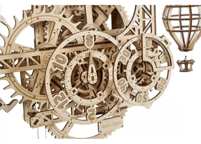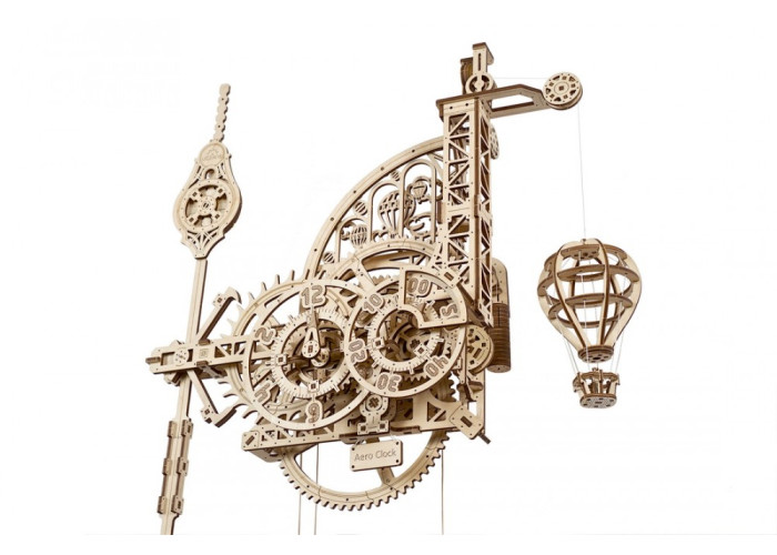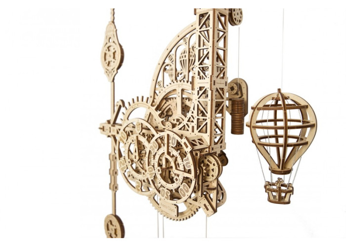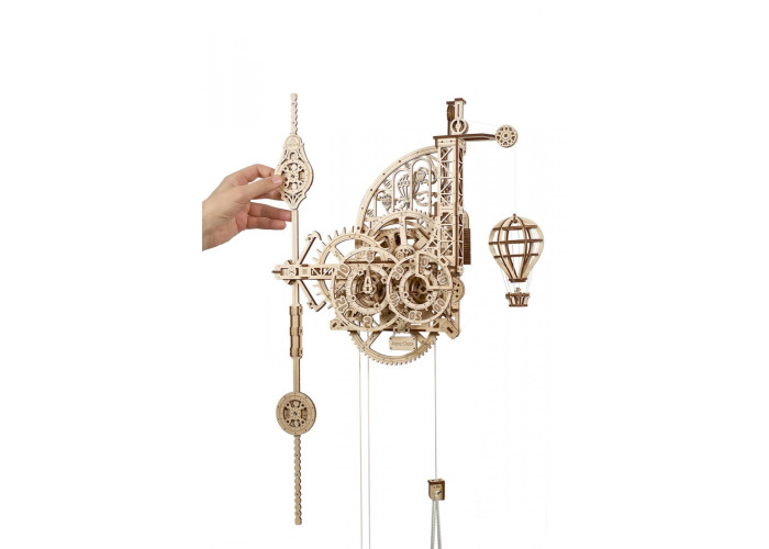 Простий та елегантний Аеро Годинник Ugears приводиться в рух гравітацією, що тягне вниз мішок із вантажем (ви можете наповнити його піском або сіллю). Щоб завести годинник, підійміть мішок, потягнувши за шнур із вагонеткою. Повільно опускаючись, мішок обертає провідну шестерню, яка, в свою чергу, обертає через редуктор анкерне колесо. З анкерним колесом взаємодіє якір, закріплений на маятнику з обважнювачами вгорі та внизу. Ви можете налаштувати хід годинника до секунди, регулюючи верхній і нижній обважнювачі маятника. Редуктор також передає обертання на годинний і хвилинний диски. Одна з цікавих особливостей нашого Аеро Годинника – час повідомляють не стрілки, що рухаються циферблатом, а фіксований покажчик, який вказує на цифри на рухомих дисках. Більше того – годинний і хвилинний диски повільно обертаються проти годинникової стрілки. Чи знаєте ви, що до стандартизації одні годинники рухалися за годинниковою стрілкою, а інші – проти? У ролі «зозулі» в Аеро Годиннику Ugears – повітряна куля. Підвішена повітряна куля швидко опускається, коли пробиває чергова година, а потім повільно піднімається вгору протягом наступної години.