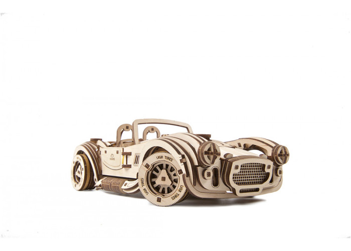 Ми вважаємо, що наша механічна Дрифт Кобра – справжня красуня зі своїми товстими шинами, плавними лініями та формами (завдяки деталям, вирізаним лазером у тонкій фанері товщиною 1 мм), відкритим дизайном. У моделі повертаються передні колеса, відчиняються двері, капот і багажник. Замість гумодвигуна, як у всіх попередніх моделях із автопарку Ugears, ми використали потужну пружину, щоб забезпечити міцність цього гоночного автомобіля та подовжити тривалість роботи моделі. Храповий механізм означає, що вам не доведеться утримувати ручку весь час, коли ви приводите модель у рух – потенційна енергія зберігається при кожному повороті, без прослизання, доки міцна внутрішня пружина не буде повністю заведена.