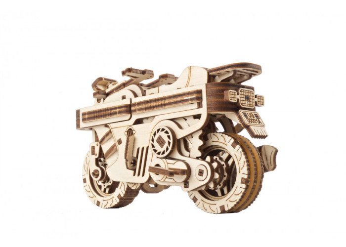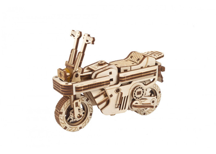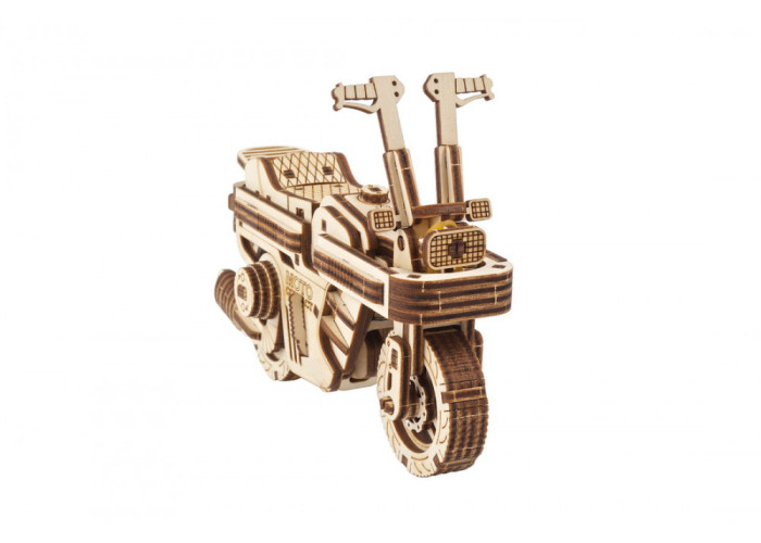 3D-конструктор Мото Компакт складаний скутер досить потужний, хоча й невеликий за розміром. Дерев’яна модель скутера приводиться в рух пружиною і здатна проїхати до 2 метрів на одному заведенні. Кермо можна розташувати в одному з трьох положень, щоб ваш скутер рухався прямо або маневрував ліворуч чи праворуч. Мото Компакт складаний скутер від Ugears оснащений передньою та задньою підвіскою. Крім того, модель оснащена відкидною ніжкою-підставкою, розташованою з лівого боку скутера.