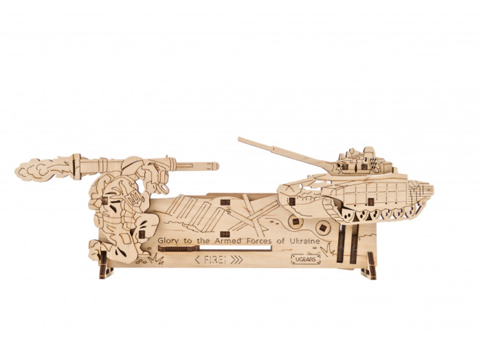 І, звісно ж, інженери та дизайнери Ugears надихалися реальними історіями з фронту. На моделі Вистрілив – забув присутній воїн Збройних сил України, який пострілом з переносного протитанкового ракетного комплексу Джавелін влучає прямо в башту танка окупантів Т72Б3. Український захисник спритний і влучний, а ворожий танк – уже без башти. На ваших очах ракета летить до танка і змушує його башту рухатись вгору та вправо, імітуючи вибух та відрив. Для українського вояка стріляти з Джавеліна – справа вже звична. Тож вистрілив – і починає шукати нові ворожі танки.