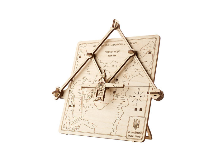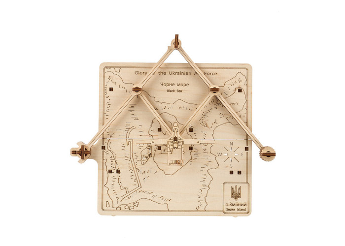Модель Визволення Зміїного – це механічна картина, на якій безпілотний літальний апарат Байрактар летить над українським островом Зміїним, розташованим у Чорному морі, що був захоплений росіянами 24 лютого та звільнений 7 липня. За допомогою системи на кшталт пантографа ви можете пересувати Байрактар над картою острова. На зворотній стороні моделі розміщено ніжки, щоб ви могли поставити свою механічну картину на видне місце і насолоджуватися нею разом із членами родини та друзями.