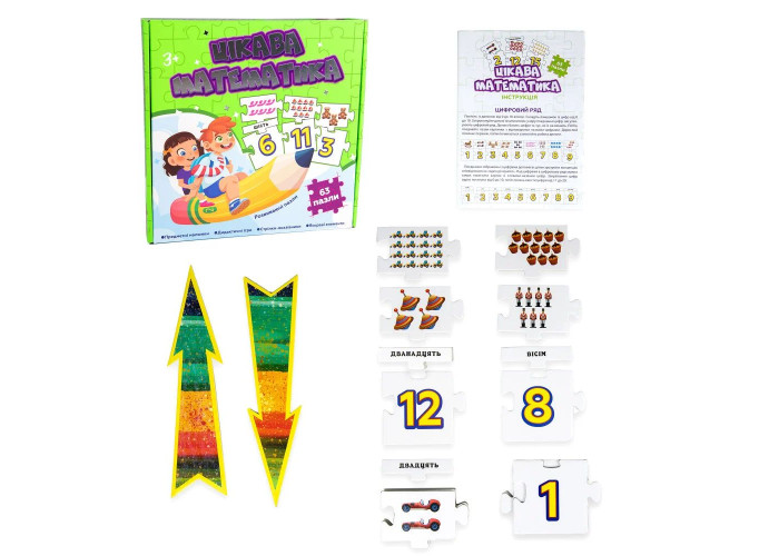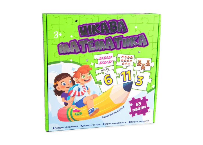 «Цікава математика» – це набір розвиваючих пазлів для знайомства дитини з цифрами і числами. Граючи з пазлами малюк навчиться складати числові ряди, з'єднувати предметні малюнки з числами та порівнювати їх між собою. Проста гра спрямована на комплексний розвиток дитини, тому вона впливає на розвиток логічного мислення, дрібної моторики та пам'яті.