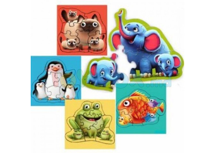 З деталей картонного конструктора малюк зможе зібрати п'ять барвистих картинок із зображенням тварин і їх дитинчат (картинки складаються з 6, 7 і 8 елементів).