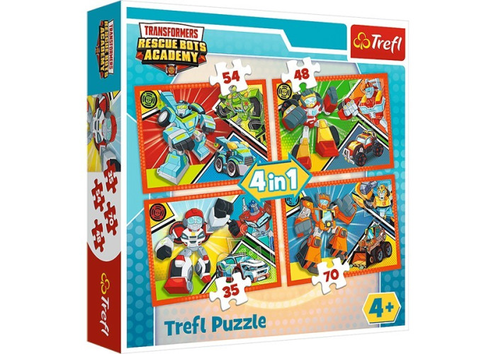 Яскраві і барвисті пазли Академія Автоботов 4в1 на 35, 48, 54 і 70 елементів. Виготовлені з якісного, щільного картону. Розвивають логічне мислення, дрібну моторику рук, посидючість.