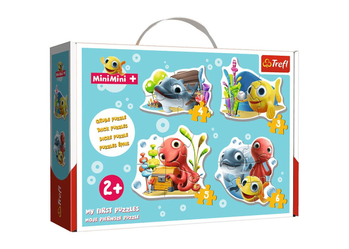 Baby Puzzle з героями каналу MiniMini, відомих усім маленьким діткам. Пазл виготовлений з щільного картону і ідеально підходить для дітей від 2 років. Яскраві кольори та зручні форми заохочують дітей до гри. Пазл складається з 4 незалежних пазлів, кожен з різною кількістю елементів (3, 4, 5, 6) і представляє рибок зі станції MiniMini, улюблених найменшими.