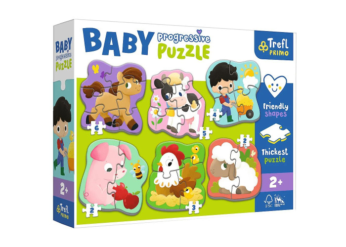 Серія Baby Progressive - це набір із шести великих фігурних пазлів із щільного картону. Зручна форма елементів робить пазли безпечними та ідеально лягає на ручку дитини.