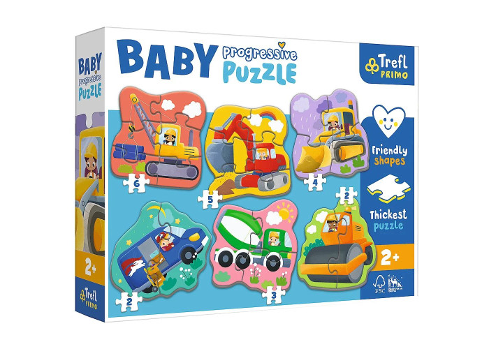 Серія Baby Progressive - це набір із шести великих фігурних пазлів із щільного картону. Зручна форма елементів робить пазли безпечними та ідеально лягає на ручку дитини.