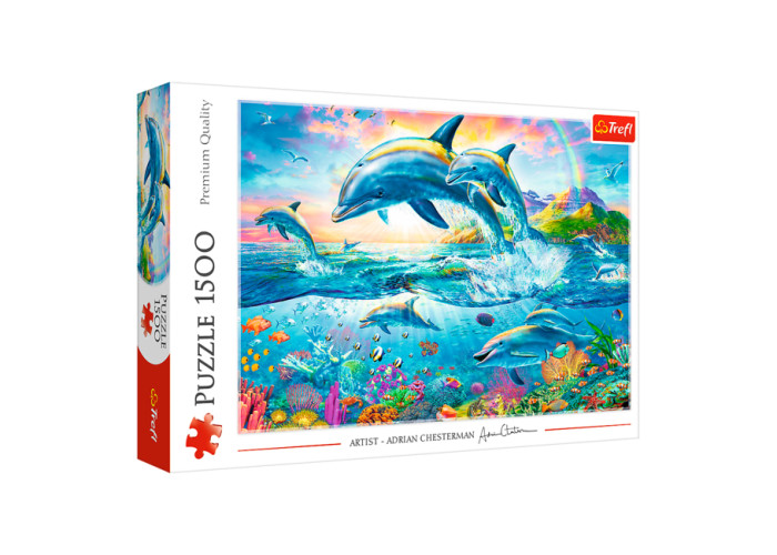 Пазли Trefl Дельфіни складається з 1500 деталей, на яких сім'я дельфінів стрибає через воду, на задньому фоні відкривається чудовий краєвид. Після складання розмір картини становитиме 85х58см.