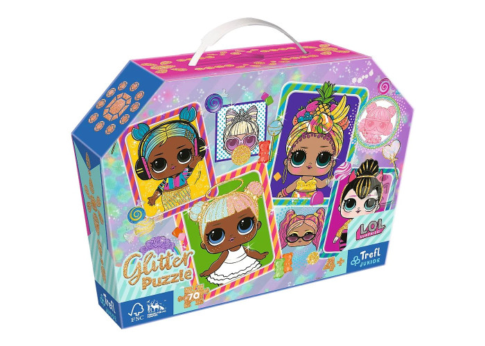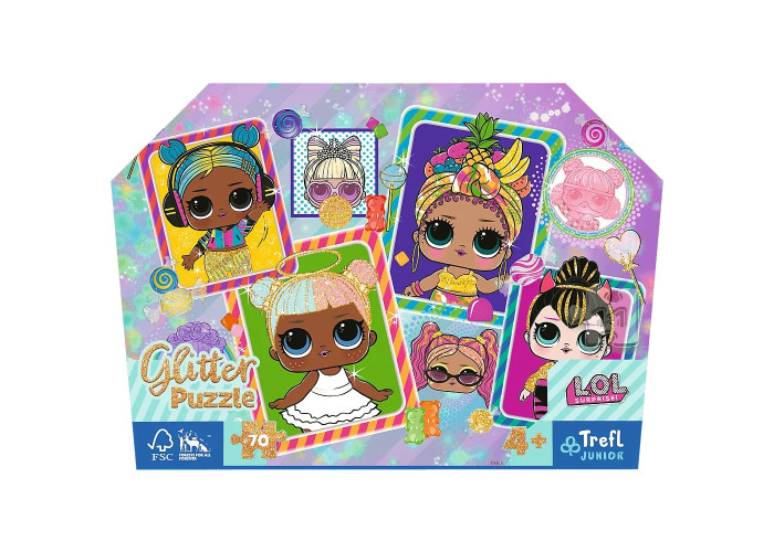 Барвисті ляльки LOL - блискучий пазл від Trefl Junior - це пазл, що складається з 70 елементів . Він прикрашений ніжним золотистим блиском, завдяки чому упаковка та окремі елементи красиво виблискують. Ідеально підходить для маленьких любителів головоломок і шанувальників ляльок-сюрпризів LOL .