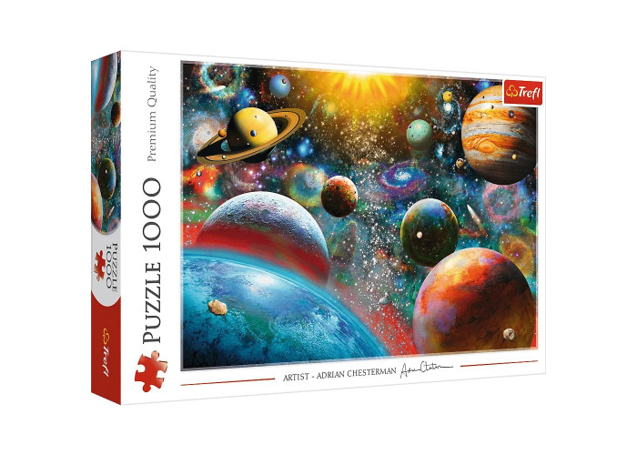 Пазл із 1000 елементів, який показує розташування планет у дивовижному космосі. Після аранжування вийде картина розміром 683х480 мм.