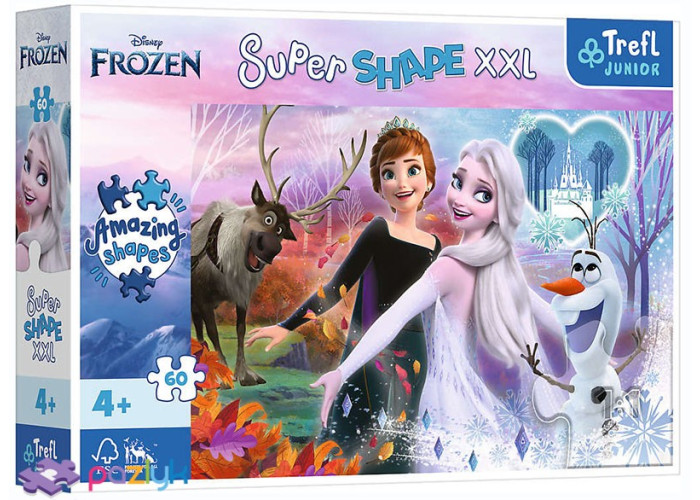 Super Shapes - це серія пазлів, до складу яких окрім класичних входять ще й фігурні елементи великих розмірів, які доставляють дитині ще більше радості та задоволення при складанні. "Крижане серце-2. Танцюючі сестри" із згаданої серії "Супер форм" - це пазли на 60 дуже великих елементів із зображенням головних персонажів популярного анімаційного фільму студії Уолта Діснея "Крижане серце-2".