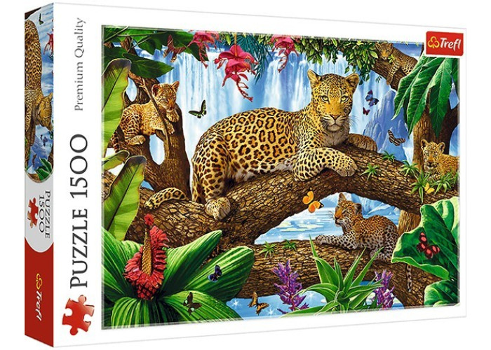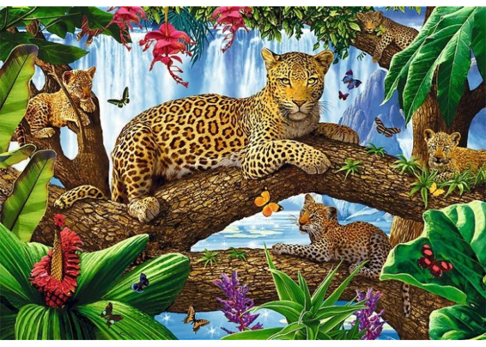 Яскраві і барвисті пазли Леопарди на дереві на 1500 елементів. Виготовлені з якісного, щільного картону. Розвивають логічне мислення, дрібну моторику рук, посидючість.