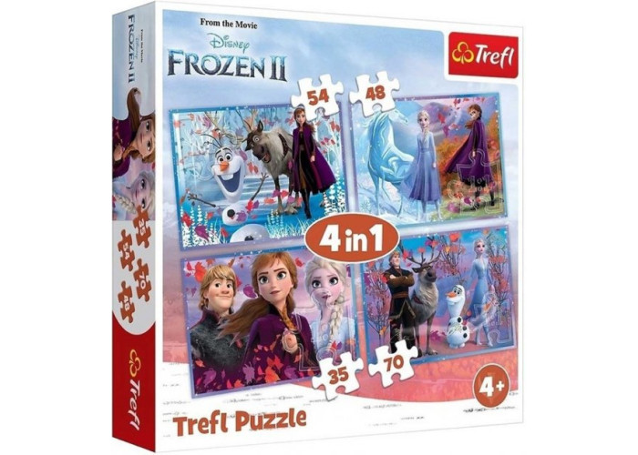 Яскраві і барвисті пазли Надзвичайна подорож, Холодне серце 2 4в1 на 35, 48, 54 і 70 елементів. Виготовлені з якісного, щільного картону. Розвивають логічне мислення, дрібну моторику рук, посидючість.
