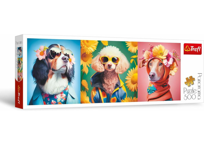 Панорамний пазл на 500 елементів, що представляє собою колаж із фотографіями милих модних песиків. Після оформлення вийде картина розміром 660х237 мм. Виріб виготовлено з високоякісних матеріалів, з використанням спеціального каландрового паперу, який відбиває світло, що полегшує його компонування. Виріб вироблено в Польщі, для виготовлення використовувалися екологічні матеріали.