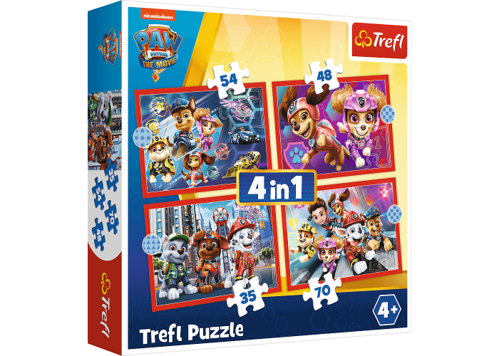 Яскраві і барвисті пазли Патруль у місті Щенячий патруль 4в1 на 35, 48, 54 і 70 елементів. Виготовлені з якісного, щільного картону. Розвивають логічне мислення, дрібну моторику рук, посидючість.