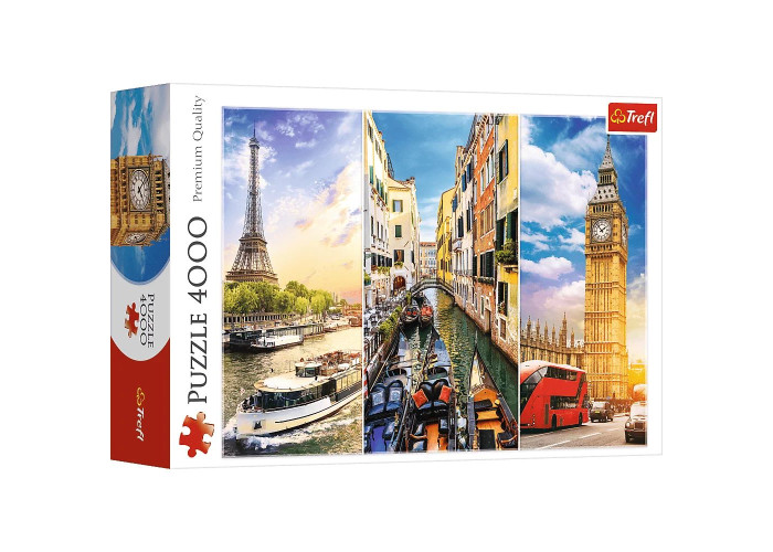 "Прогулянка Європою" - це пазл з 4000 елементів, на якому зображено колаж із видами європейських міст - Парижа, Венеції та Лондона. Після аранжування вийде вражаючий плакат розміром 136х96 см.