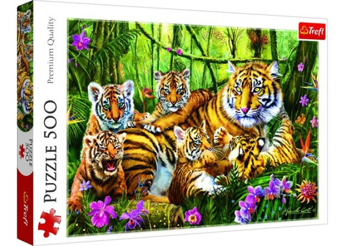 Яскраві і барвисті пазли Сім'я тигрів на 500 елементів. Виготовлені з якісного, щільного картону. Розвивають логічне мислення, дрібну моторику рук, посидючість.