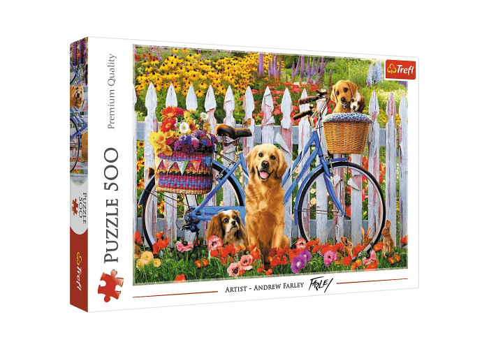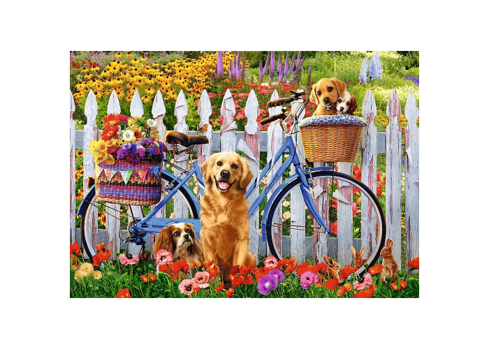 Пазл з 500 елементів із зображенням собак у саду. Після аранжування буде створено малюнок розміром 580 х 340 мм.