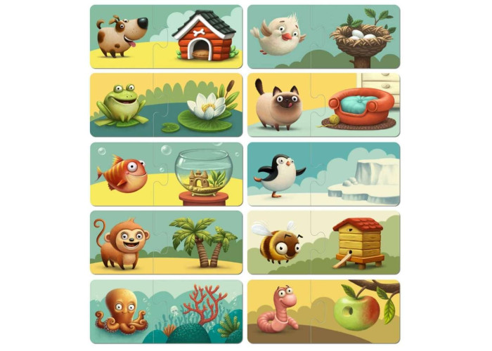 - цей пазл логічна гра, в якій дитина повинна вибудувати ланцюжок з тваринного і місця, в якому ця тварина живе.