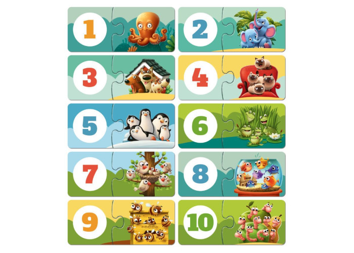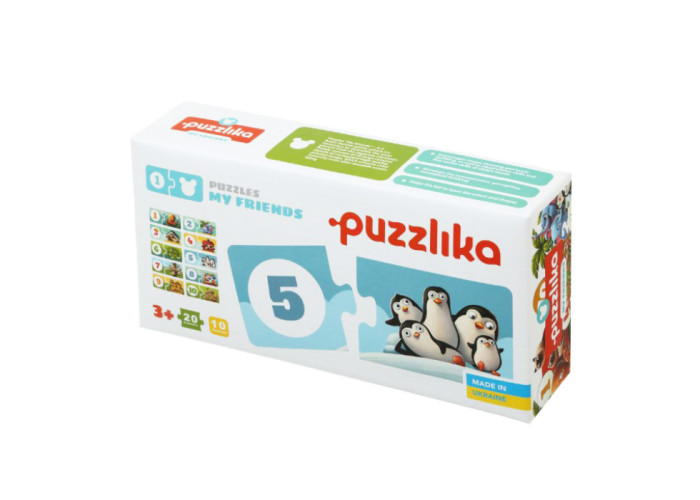 Розвиваючий пазл Левеня Puzzlika Мої друзі 20 елементів - пазли з 10 окремих картинок, кожна на 2 елемента. Цей пазл логічна гра, в якій дитина повинна вибудувати ланцюжок з тваринного і місця, які відповідають кількості тварин на пазлі. Розвиває рахунок і навчає різним тваринам. Розвиваючі пазли у вигляді логічних ігор сприяють розвитку мислення і уяви