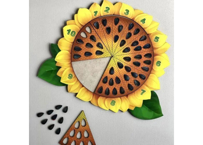 За допомогою такого кольорового математичного соняшнику можна легко вивчити з дитиною цифри і навчити її рахувати. Гра також підходить для вивчення дробів та допомагає в ігровій формі зрозуміти і побачити, що таке "частина і ціле". Насіння - це відмінний рахунковий і сортувальний матеріал.
