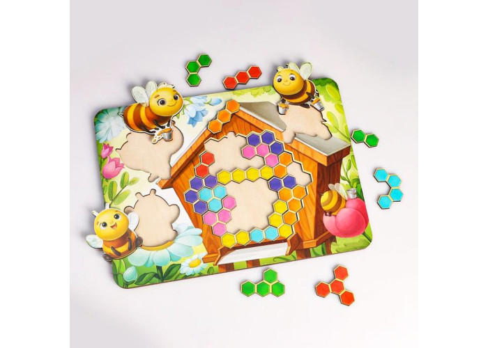 Яскрава та цікава гра. Бджілки - це вкладиші, а сам вулик-будиночок - це тетріс, який малюку необхідно зібрати (можна користуватися спочатку картинкою-підказкою). Усі деталі легко діставати пальчиками. Запропонуйте дитині порахувати шестикутники за кольором. Придумайте цікаву історію про бджілок-трудівниць.