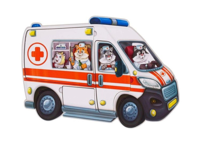 Пазл-мозаїка двошаровий у вигляді швидкої допомоги. Збираючи пазл, можна пограти в бригаду швидкої допомоги, яка приїжджає на виклик до хворого плюшевого друга або лялечки.