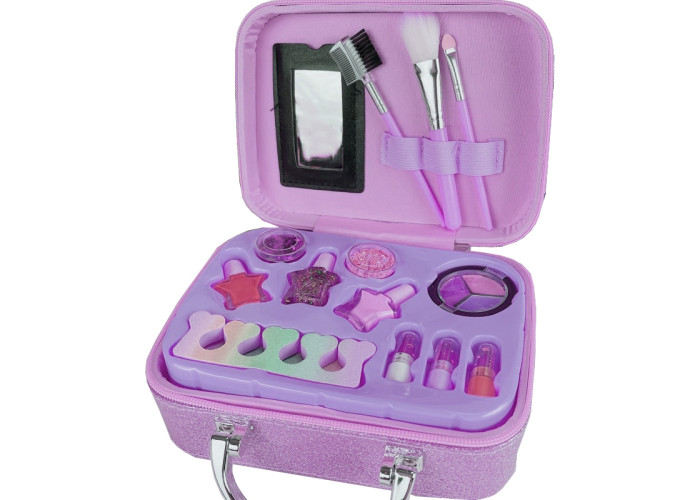 1. Чарівний набір для макіяжу: набір косметики включає в себе 1 рум'яна, 2 світлі блискітки тіні для повік, 3 помади, 3 лаки для нігтів, манікюрний сепаратор, 3 кистей для макіяжу, 1 валізку для зберігання.
