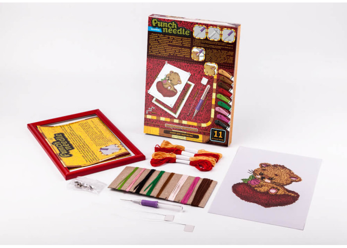 У комплекті: полотно зі схемою-рисунком для створення вишивки, багетна рамка, канцелярські кнопки, ручний ткацький верстат, комплект різнокольорових ниток муліне, ниткодівач та інструкція.