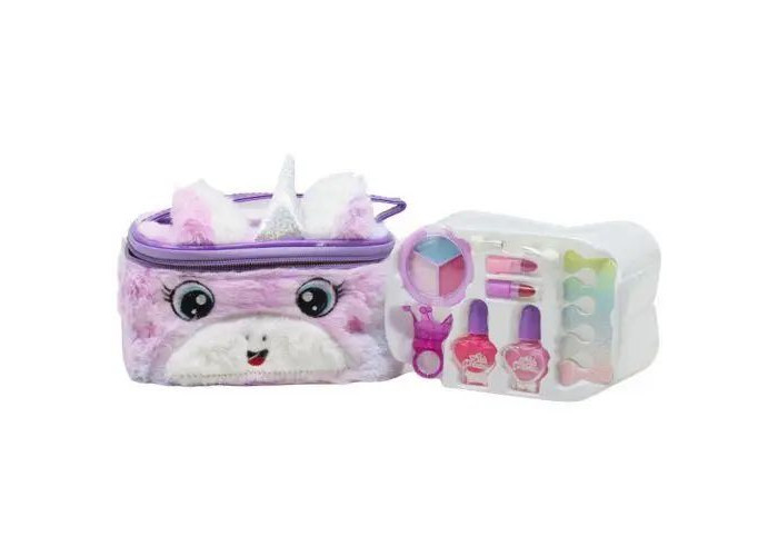 косметичка; сияющий блеск для губ в виде кольца; 2 детские помады для губ; 2 лака для ногтей, без содержания ацетона, без запаха; маленькая палитра теней; аппликатор для теней; разделитель пальцев, розовый для педикюра.