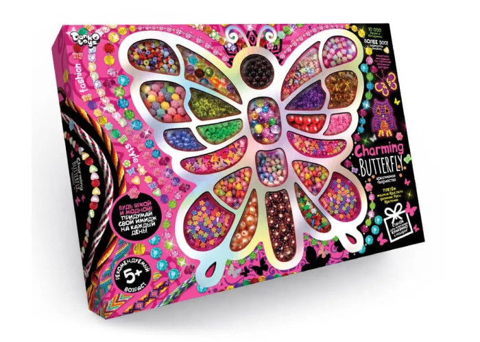 Набір для творчості Charming Butterfly, упаковка картонна коробка. У комплекті: полімерна блістерна форма-органайзер "метелик", різнокольоровий бісер, різнокольорові кристали, волосінь, ігровий верстат для плетіння джгутів «Куміхімо», набір різнокольорових ниток-муліне, комплект різнокольорових намистин, металеві застібки-закрутки, асорті, металевий замок , інструкції.