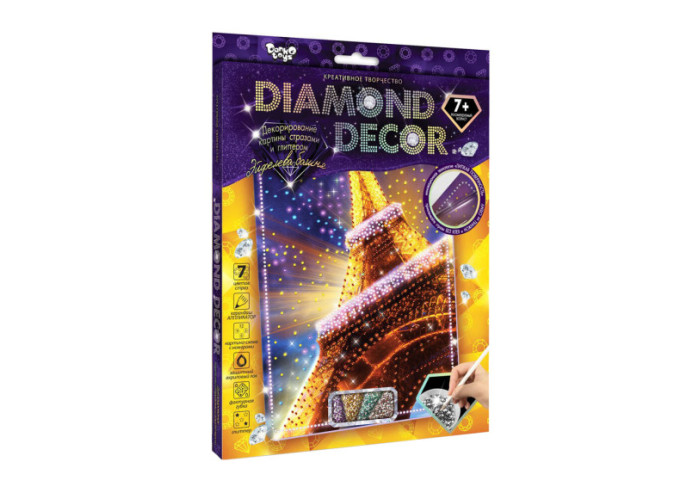 "Diamond Decor" – серія наборів креативної творчості, виконана в техніці декорування стразами, призначена не тільки для дорослих, але і для дітей! Проста у виконанні і дуже красива картина, сяятиме «Діамантовим Блиском», полонивши і підкоряючи погляди найдосвідченіших глядачів! Кожен встановлений камінь, передає і випромінює неповторний і тільки помітний оку, чарівний блиск, а сяючий гліттер, надає картині додаткове сяйво! Зробити такий шедевр дуже просто і під силу навіть дитині! На картину нанесений липкий шар, який дозволить без КЛЕЮ закріпити стрази, а вказані номери роблять роботу дуже простою та інтуїтивно зрозумілою! Спеціальний олівець-аплікатор для захоплення та розставляння страз допоможе з легкістю розставити «алмази» по своїх місцях. Отже, беремо картину, стрази та гліттер, і приступаємо до створення сяючого шедевра, який стане не лише гарною прикрасою Вашої оселі, а й безцінним подарунком близької людини! Розмір упаковки: 27,5х22х1,5 см. Вік: 7+