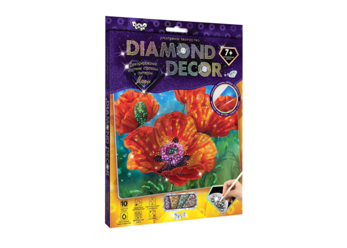 "Diamond Decor" – серія наборів креативної творчості, виконана в техніці декорування стразами, призначена не тільки для дорослих, але і для дітей! Проста у виконанні і дуже красива картина, сяятиме «Діамантовим Блиском», полонивши і підкоряючи погляди найдосвідченіших глядачів! Кожен встановлений камінь, передає і випромінює неповторний і тільки помітний оку, чарівний блиск, а сяючий гліттер, надає картині додаткове сяйво! Зробити такий шедевр дуже просто і під силу навіть дитині! На картину нанесений липкий шар, який дозволить без КЛЕЮ закріпити стрази, а вказані номери роблять роботу дуже простою та інтуїтивно зрозумілою! Спеціальний олівець-аплікатор для захоплення та розставляння страз допоможе з легкістю розставити «алмази» по своїх місцях. Отже, беремо картину, стрази та гліттер, і приступаємо до створення сяючого шедевра, який стане не лише гарною прикрасою Вашої оселі, а й безцінним подарунком близької людини! Розмір упаковки: 27,5х22х1,5 см. Вік: 7+