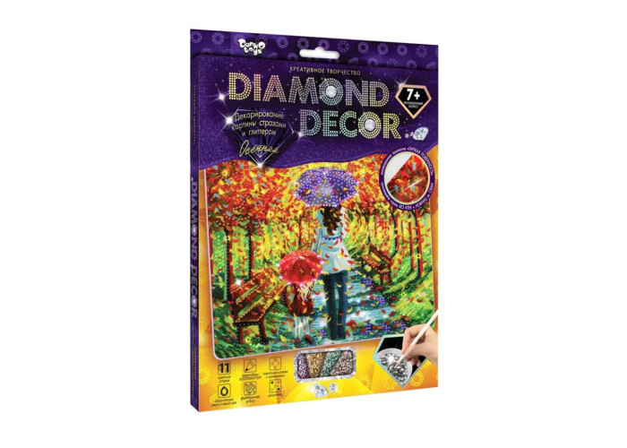 "Diamond Decor" – серія наборів креативної творчості, виконана в техніці декорування стразами, призначена не тільки для дорослих, але і для дітей! Проста у виконанні і дуже красива картина, сяятиме «Діамантовим Блиском», полонивши і підкоряючи погляди найдосвідченіших глядачів! Кожен встановлений камінь, передає і випромінює неповторний і тільки помітний оку, чарівний блиск, а сяючий гліттер, надає картині додаткове сяйво! Зробити такий шедевр дуже просто і під силу навіть дитині! На картину нанесений липкий шар, який дозволить без КЛЕЮ закріпити стрази, а вказані номери роблять роботу дуже простою та інтуїтивно зрозумілою! Спеціальний олівець-аплікатор для захоплення та розставляння страз допоможе з легкістю розставити «алмази» по своїх місцях. Отже, беремо картину, стрази та гліттер, і приступаємо до створення сяючого шедевра, який стане не лише гарною прикрасою Вашої оселі, а й безцінним подарунком близької людини! Розмір упаковки: 27,5х22х1,5 см. Вік: 7+