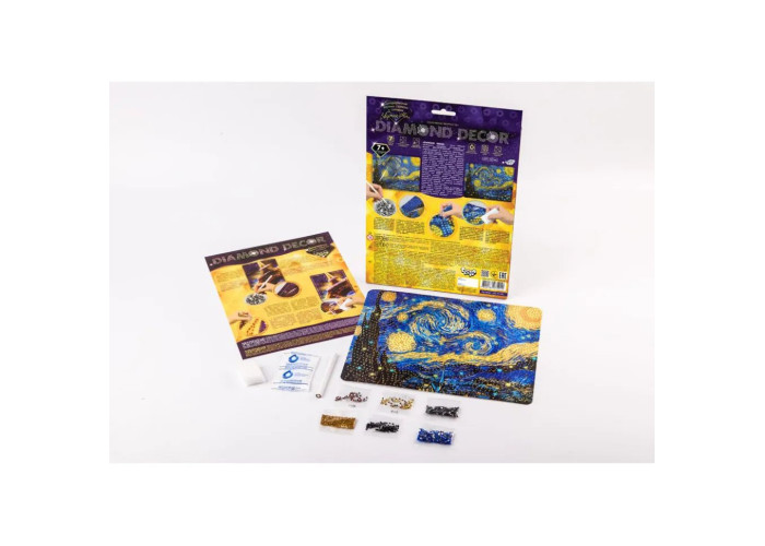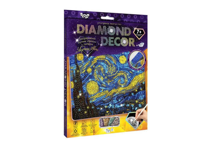 "Diamond Decor" – серія наборів креативної творчості, виконана в техніці декорування стразами, призначена не тільки для дорослих, але і для дітей! Проста у виконанні і дуже красива картина, сяятиме «Діамантовим Блиском», полонивши і підкоряючи погляди найдосвідченіших глядачів! Кожен встановлений камінь, передає і випромінює неповторний і тільки помітний оку, чарівний блиск, а сяючий гліттер, надає картині додаткове сяйво! Зробити такий шедевр дуже просто і під силу навіть дитині! На картину нанесений липкий шар, який дозволить без КЛЕЮ закріпити стрази, а вказані номери роблять роботу дуже простою та інтуїтивно зрозумілою! Спеціальний олівець-аплікатор для захоплення та розставляння страз допоможе з легкістю розставити «алмази» по своїх місцях. Отже, беремо картину, стрази та гліттер, і приступаємо до створення сяючого шедевра, який стане не лише гарною прикрасою Вашої оселі, а й безцінним подарунком близької людини! Розмір упаковки: 27,5х22х1,5 см. Вік: 7+